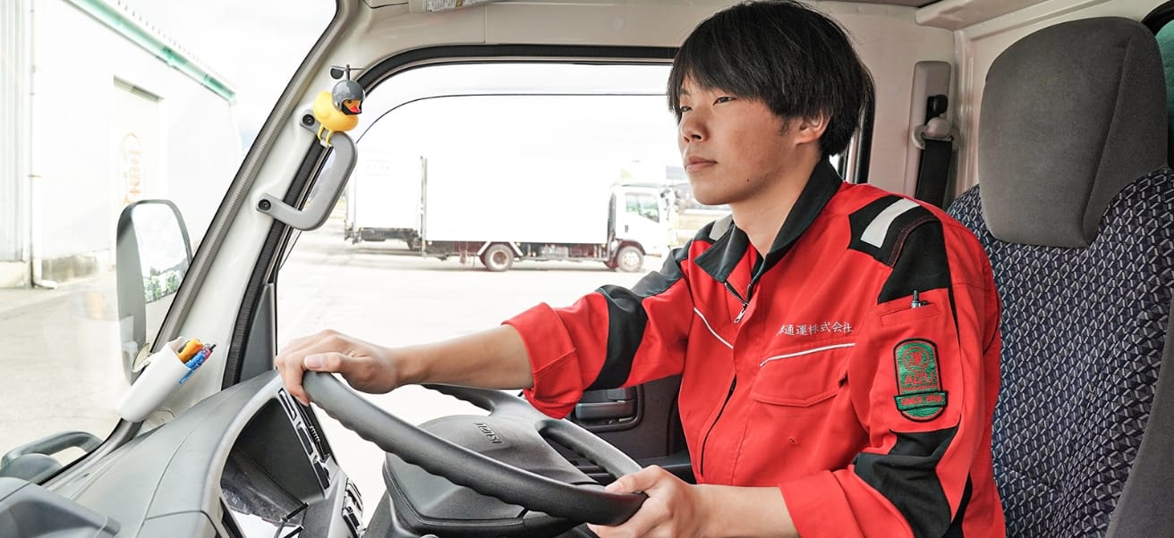 新卒で入社しました。来春で丸1年になります。車が好きで、小さい頃からトラック運転手になりたいと思っていました。高校の就職活動で會津通運の求人票を見て、意識するようになりました。用事があって自宅から会津若松市内に向かう時などに会社の前を通ると、いつもきれいに洗車されたトラックが並んでいて、「いいなぁ」と思って決めました。