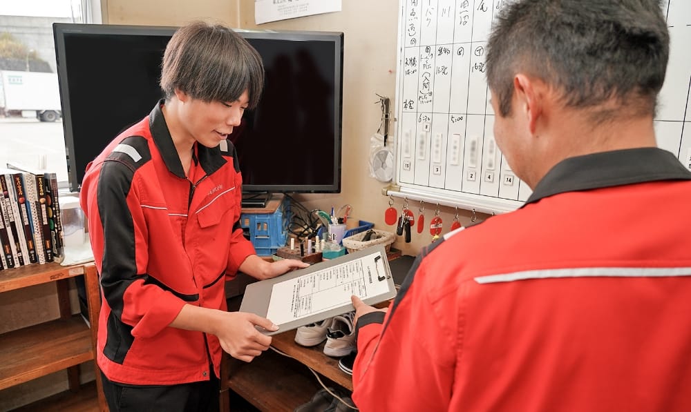 運転免許は、高校生の時に準中型免許を取りました。入社したばかりの頃、ドライブレコーダーの画像などで事故事例を見ながら、未然に防ぐ対策や、起きた時の対処法などの研修を受けました。その後、トラックを安全に乗りこなす方法などを先輩方に教えていただきました。場内でバックの練習をする時とか、すごく緊張したことを今でも覚えています(笑)。それが済むと横のりです。先輩が運転する大型車や中型車の助手席に乗って、ルートや荷物の積み方や下ろし方、扱い方を教わりました。